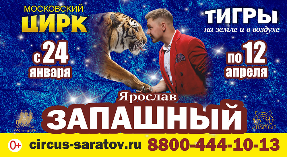 Впервые с 24 января по 12 апреля в Саратовском цирке начинает гастроли новая программа, при участии потомственного артиста старейшей династии в пятом поколении Ярослава Запашного, с аттракционом «Тигры на земле и в воздухе».